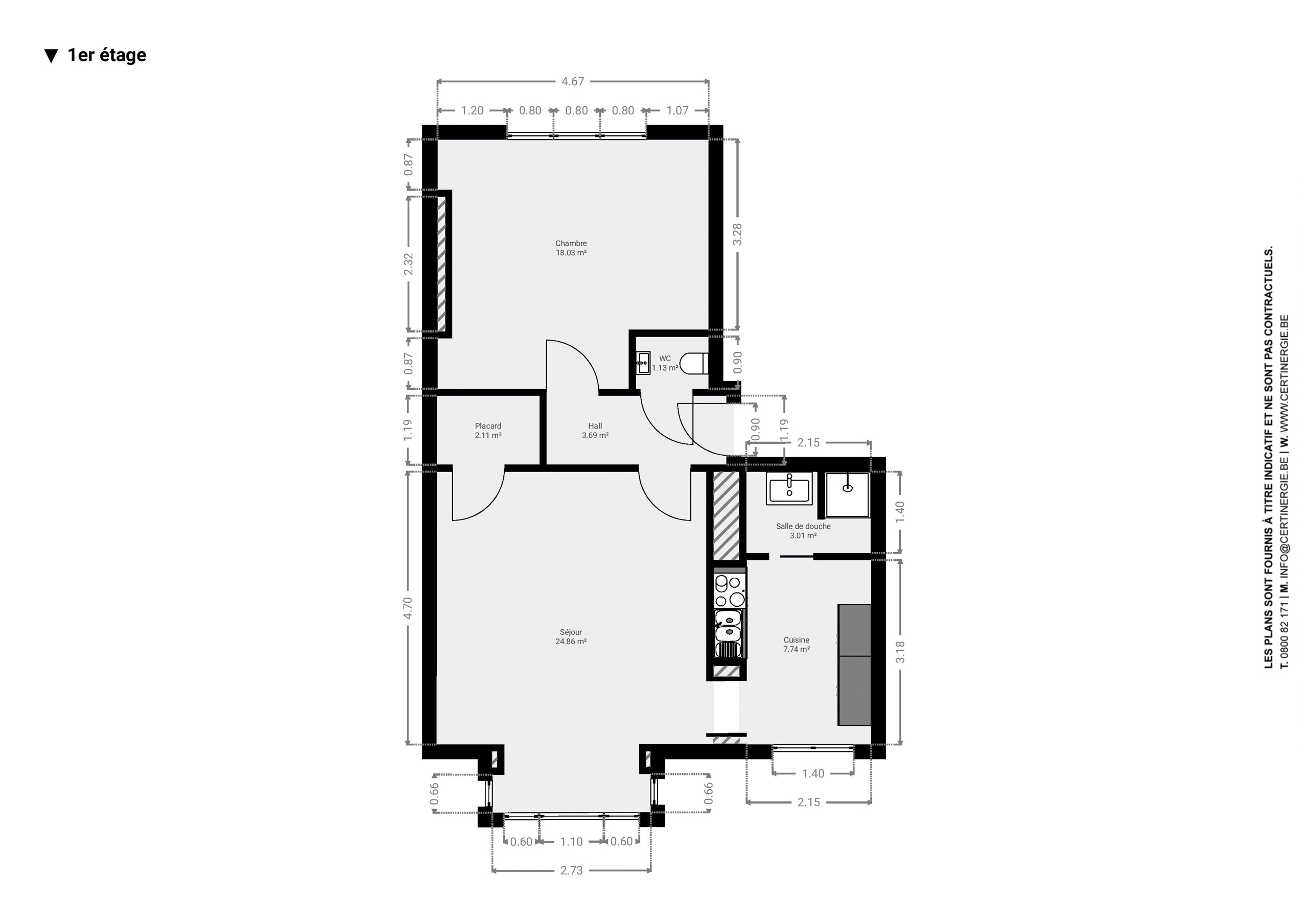 Un hall, un séjour de 25 m², une cuisine équipée, une salle de douche, une chambre de 18 m², un WC individuel et un placard.
