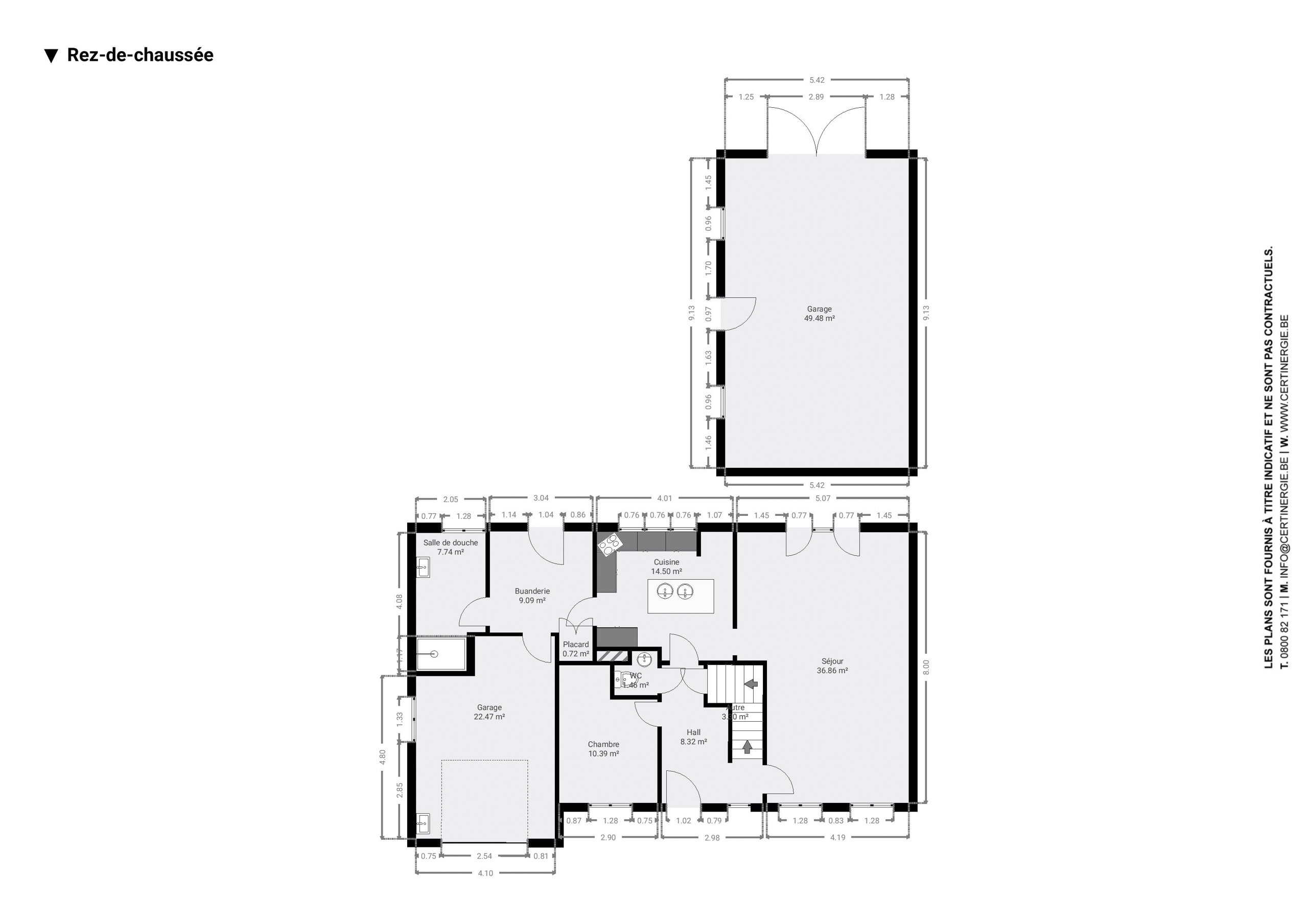 RDC : hall d'entrée, WC, lumineux séjour de 37m² avec accès au jardin, cuisine de 15m², buanderie, SDD, chambre ou bureau de 10m² et garage de 23m².